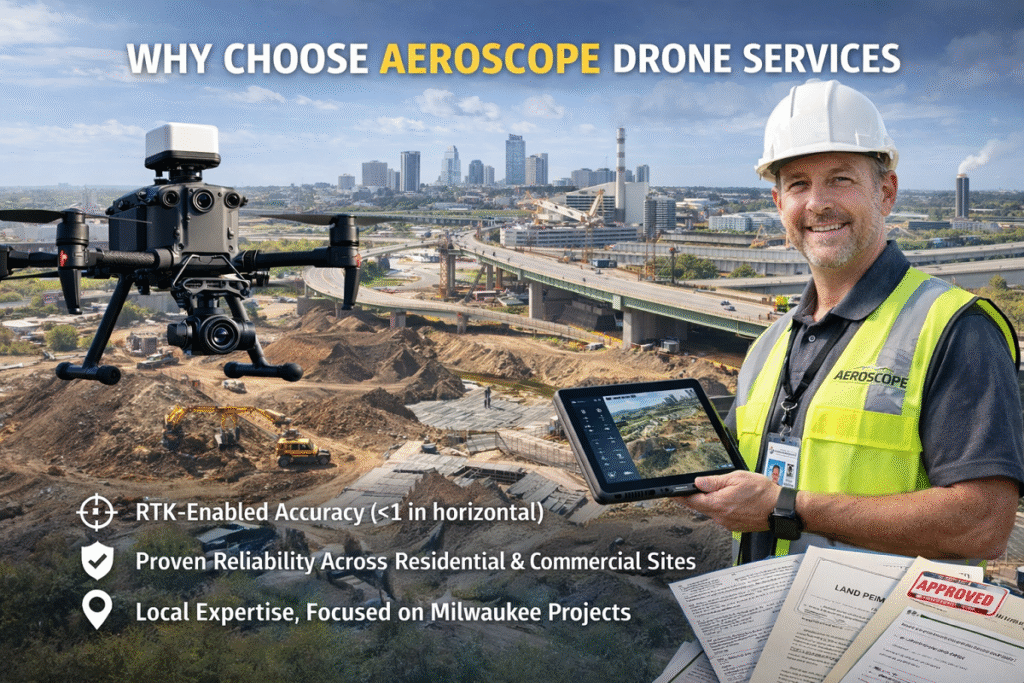 Based in Milwaukee, Aeroscope Drone Services specializes in high-accuracy photogrammetry and aerial inspections. Our founder and chief pilot is FAA Part 107 certified pilot, is fully insured, and has 20+ years of I.T. experience. We deliver reliable mapping solutions that help builders, municipalities, and land managers make smarter decisions.